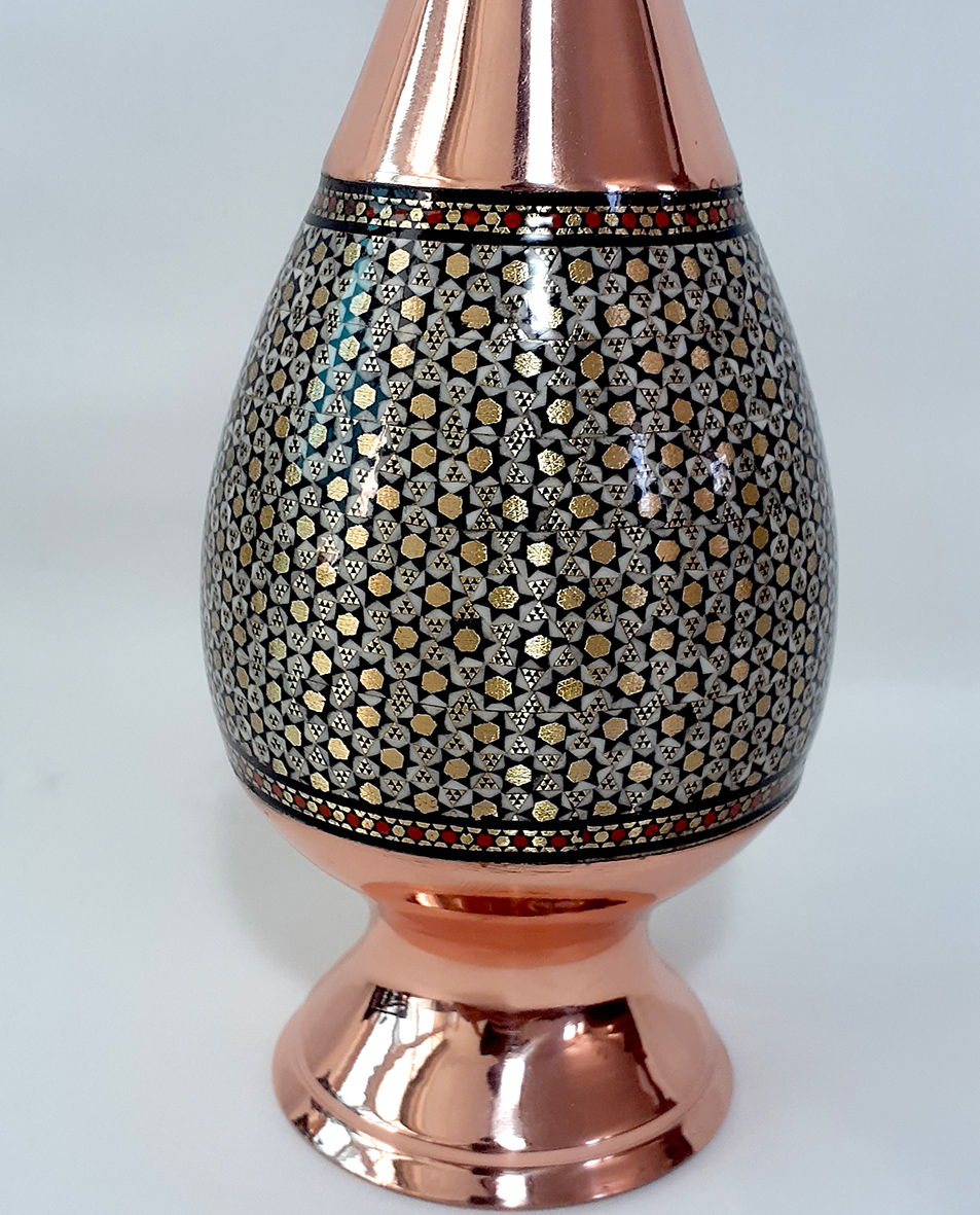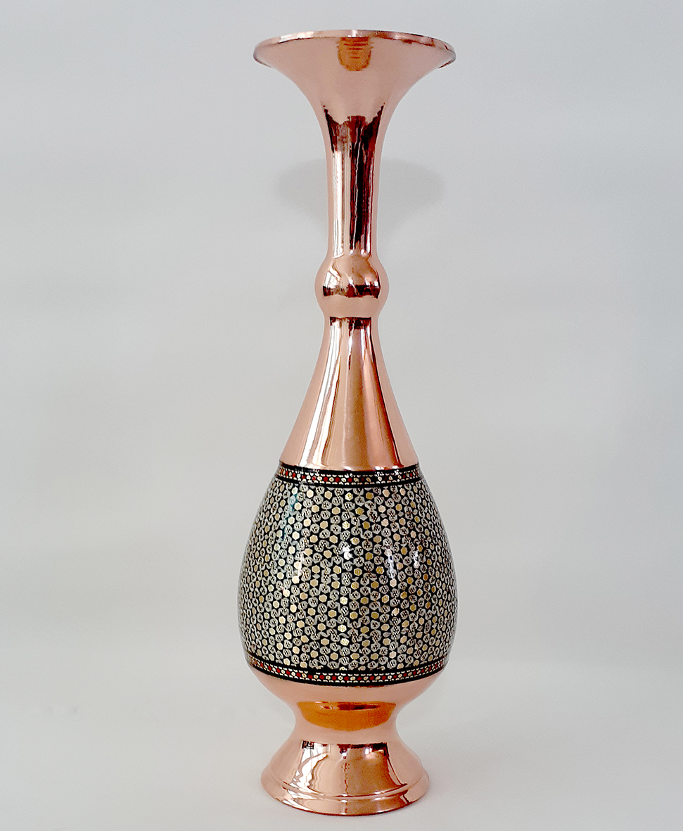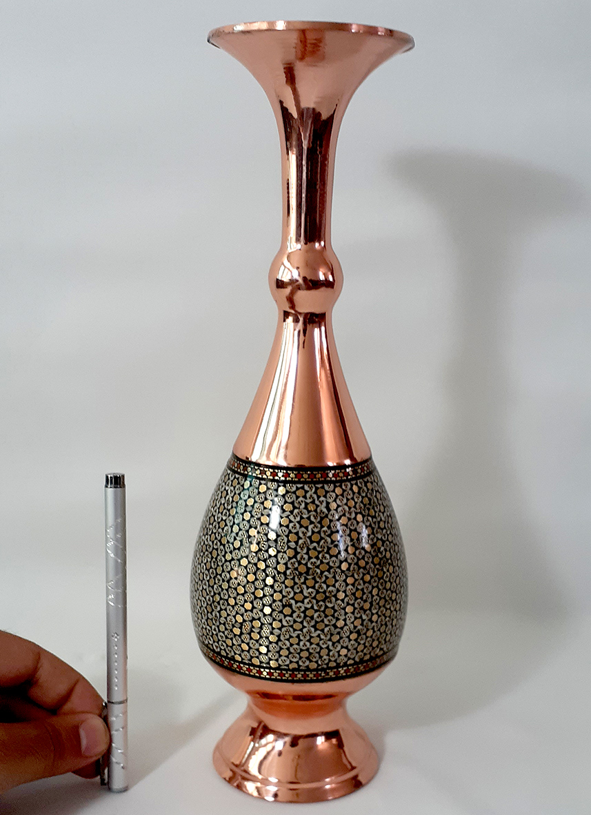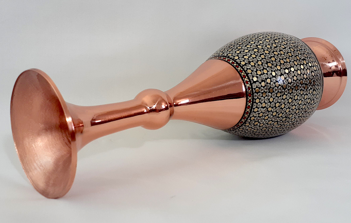 گلدانها مهمترین و کاربردیترین وسایل تزیینی در محیطهای مختلف هستند. گلدان صراحی مس و خاتم یکی از زیباترین تولیدات این صنایع دستی است که در اندازههای مختلف ساخته شده و با محیطهای گوناگون قابل ست شدن است. گلدان مس و خاتم با قرار گرفتن در دکوراسیونهای مختلف جلوه زیبایی همراه با اصالت ایرانی به فضا میدهد.