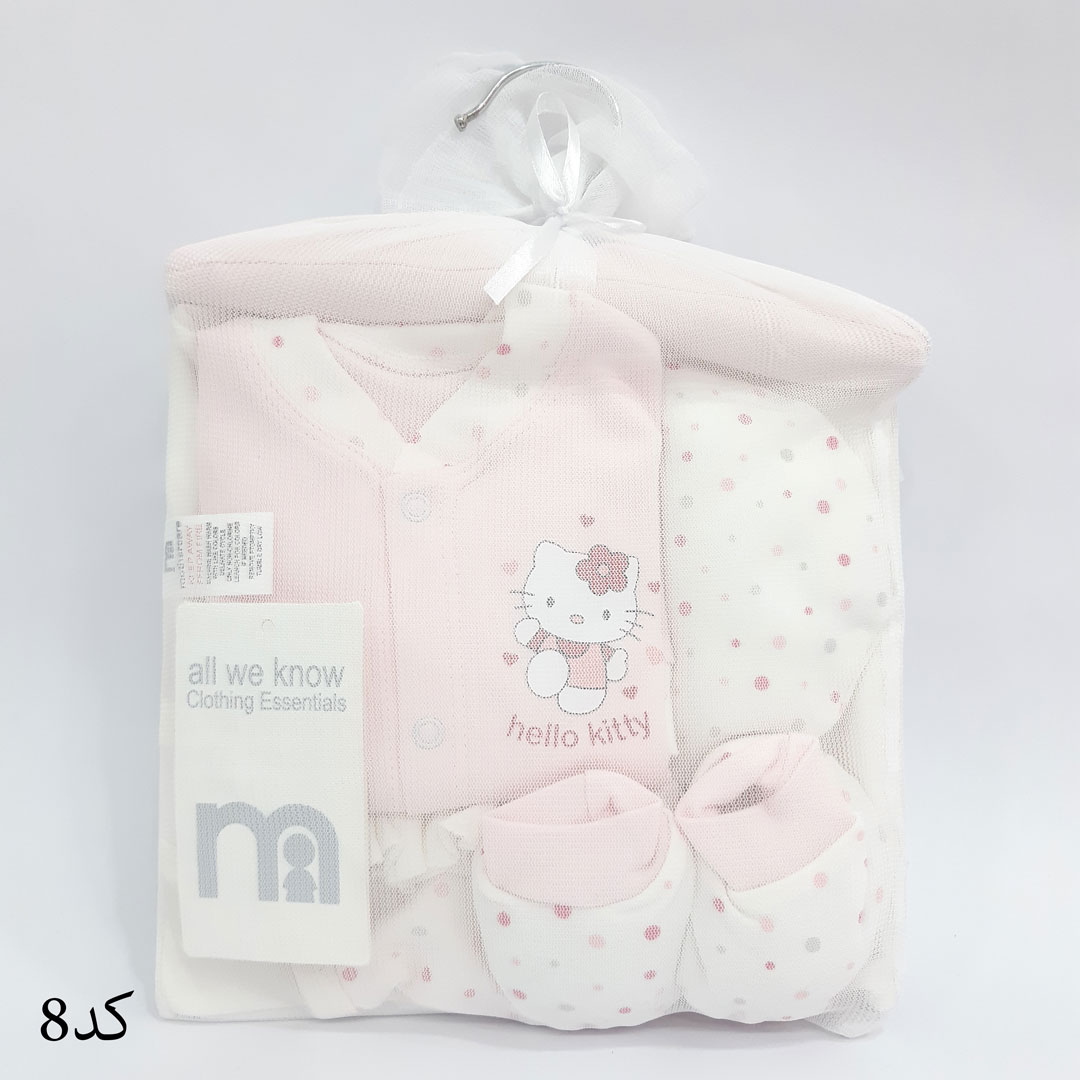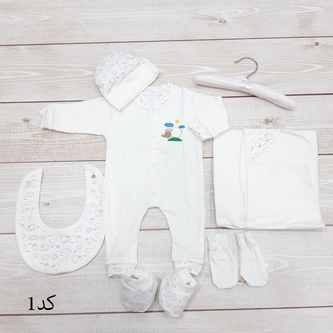 هفت تکه شامل چوب لباسی، سرهمی، دورپیچ، کلاه، پیشبند، دستکش و پاپوش