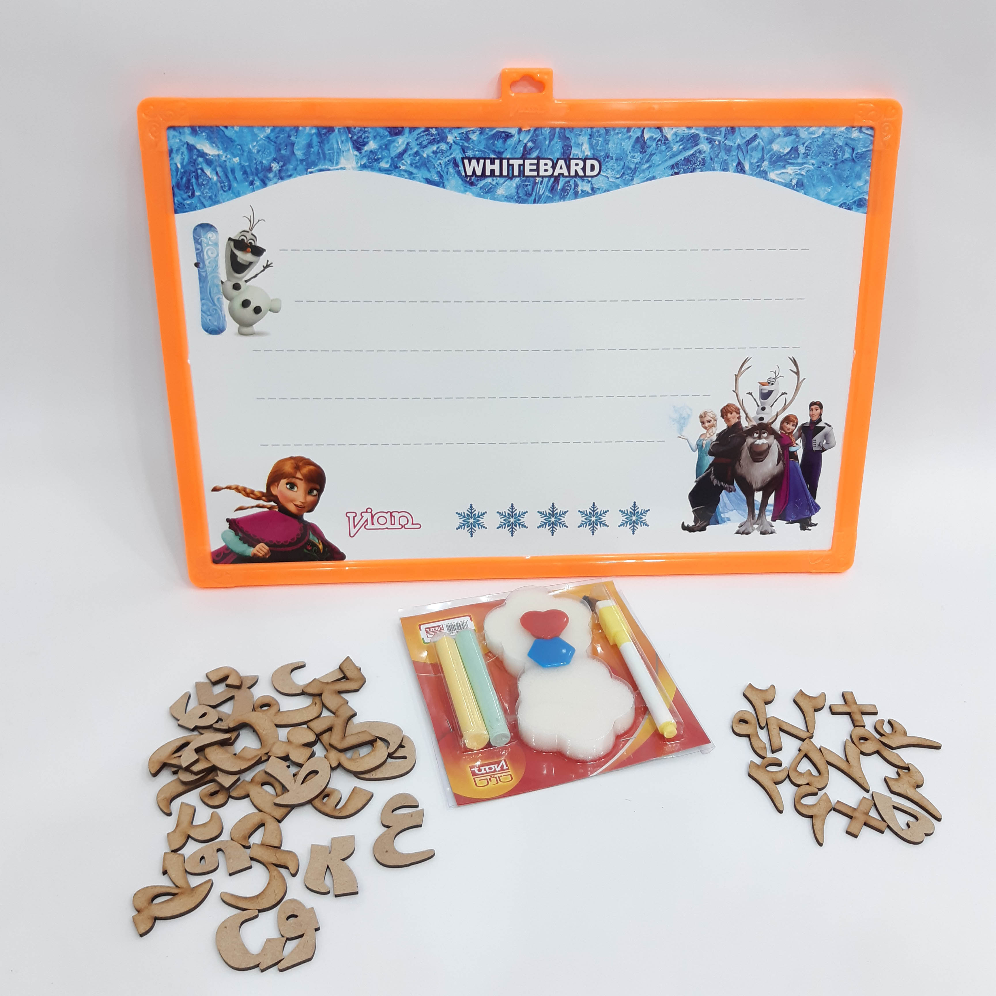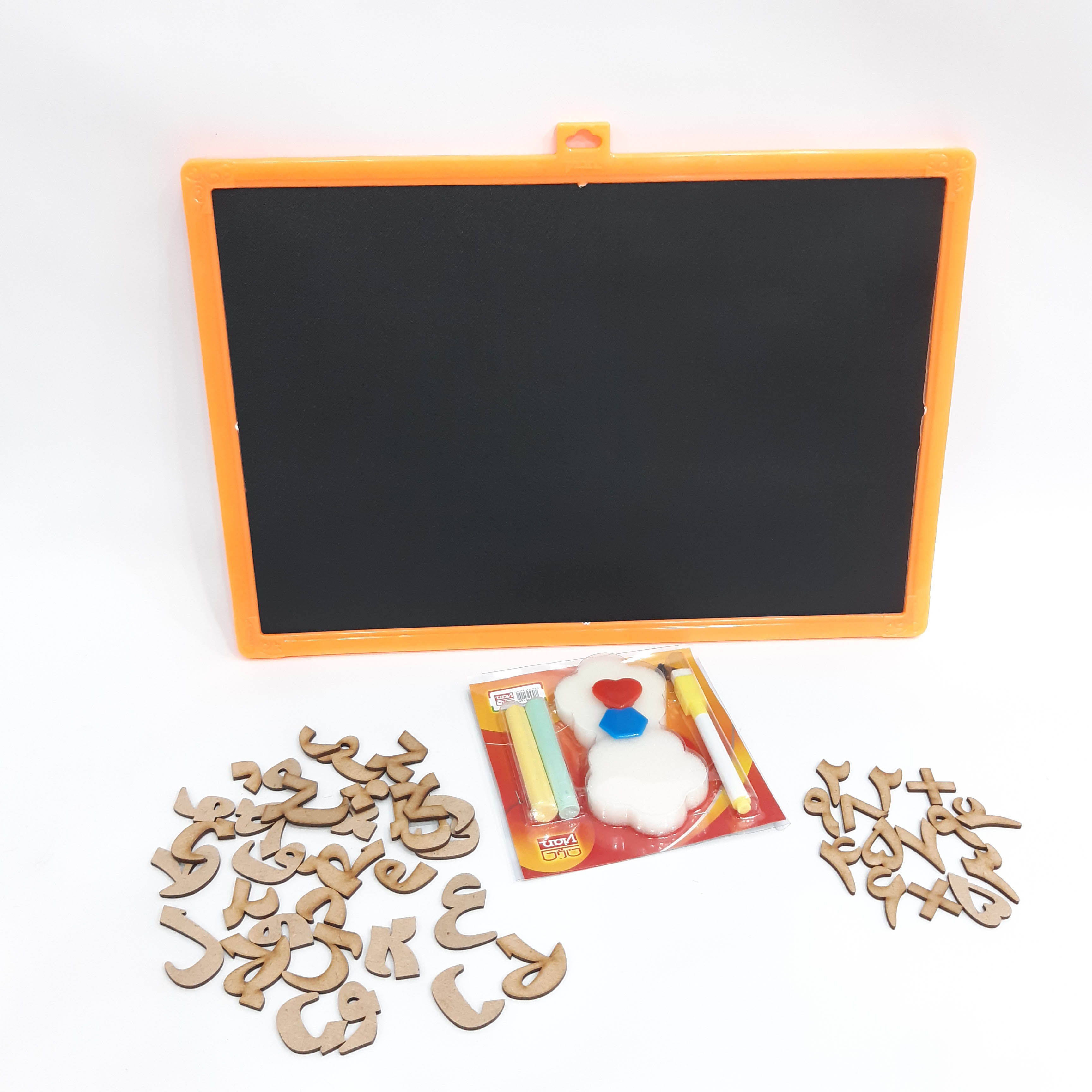 اقلام همراه: - دو عدد گچ رنگی - یک عدد ماژیک - دو عدد تخته پاک کن،حروف الفبا،اعداد